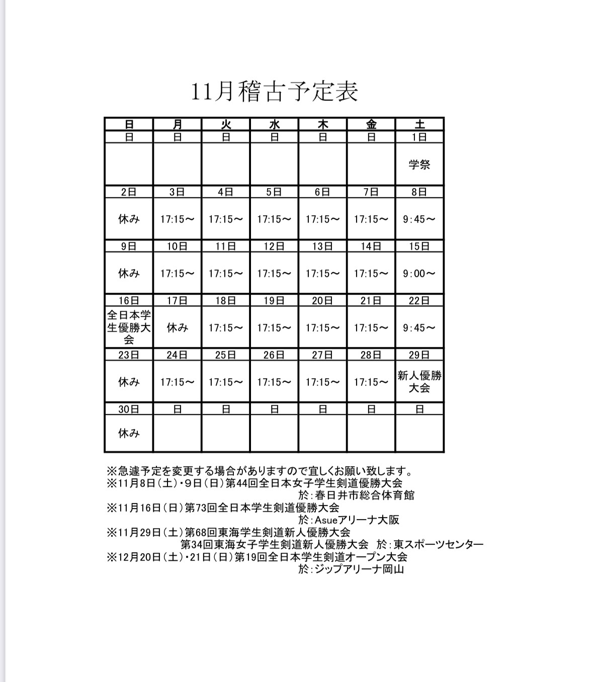 | 11月23日(土) | 第62回 東海学生剣道新人優勝大会 第28回 東海女子学生剣道新人優勝大会 |